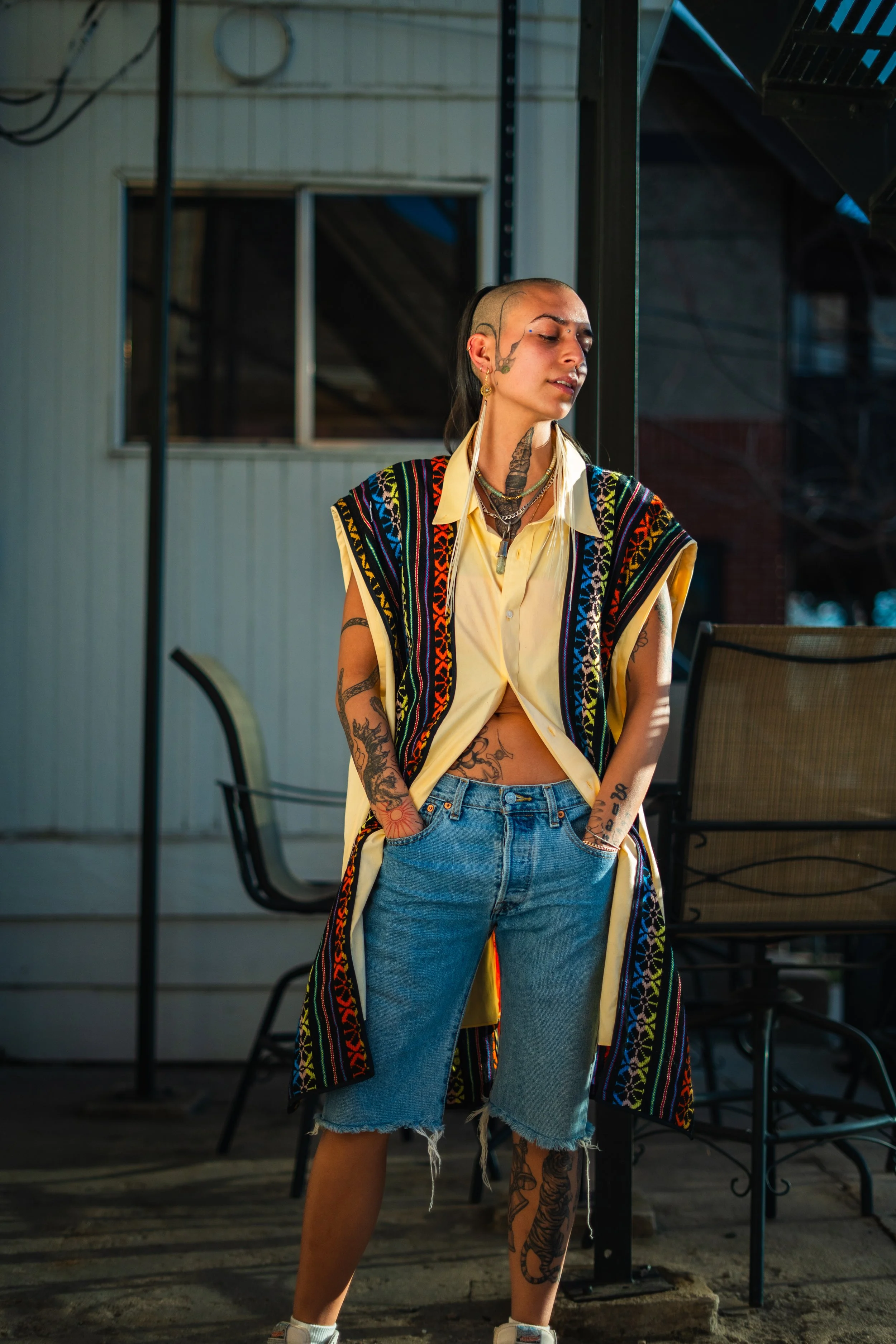 This one-of-a-kind oversized denim jacket transforms wearable fashion into a moving canvas. Distressed tears throughout the jacket are patched with hand-painted canvas — original chunks of abstract acrylic artwork in neon hues of orange, green, and yellow. Each patch carries the energy of brushstrokes, blending the grit of denim with the vibrancy of painting.